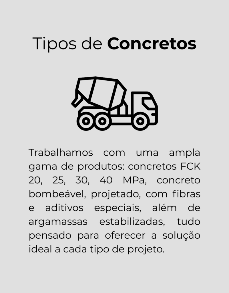 Nosso compromisso vai além do concreto: entregamos confiança e segurança. Garantimos atendimento ágil com entrega em até 24 horas, utilizando frota própria e equipe qualificada, sempre preparados para suprir as necessidades da sua obra com precisão e eficiência.